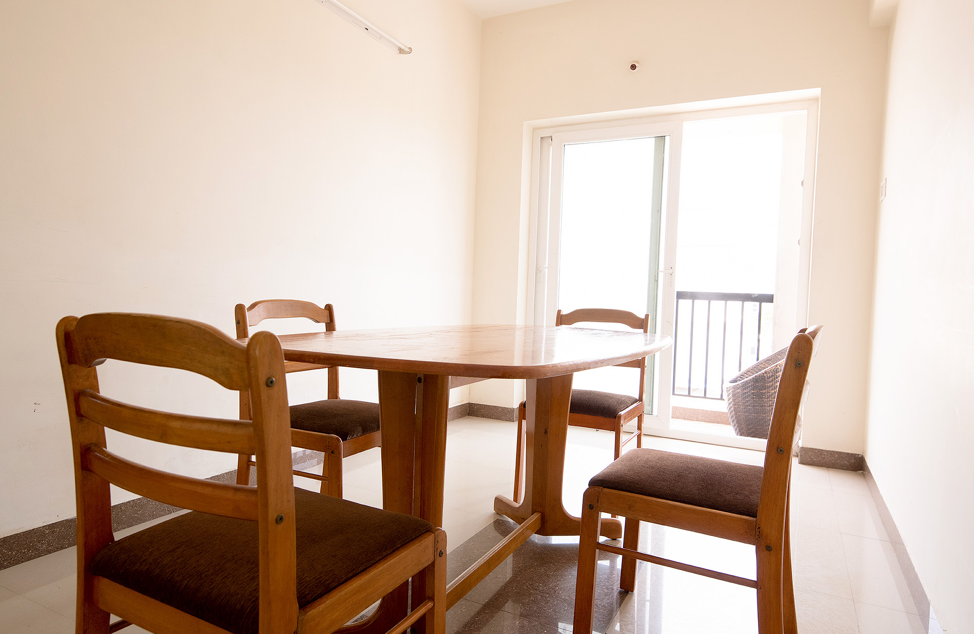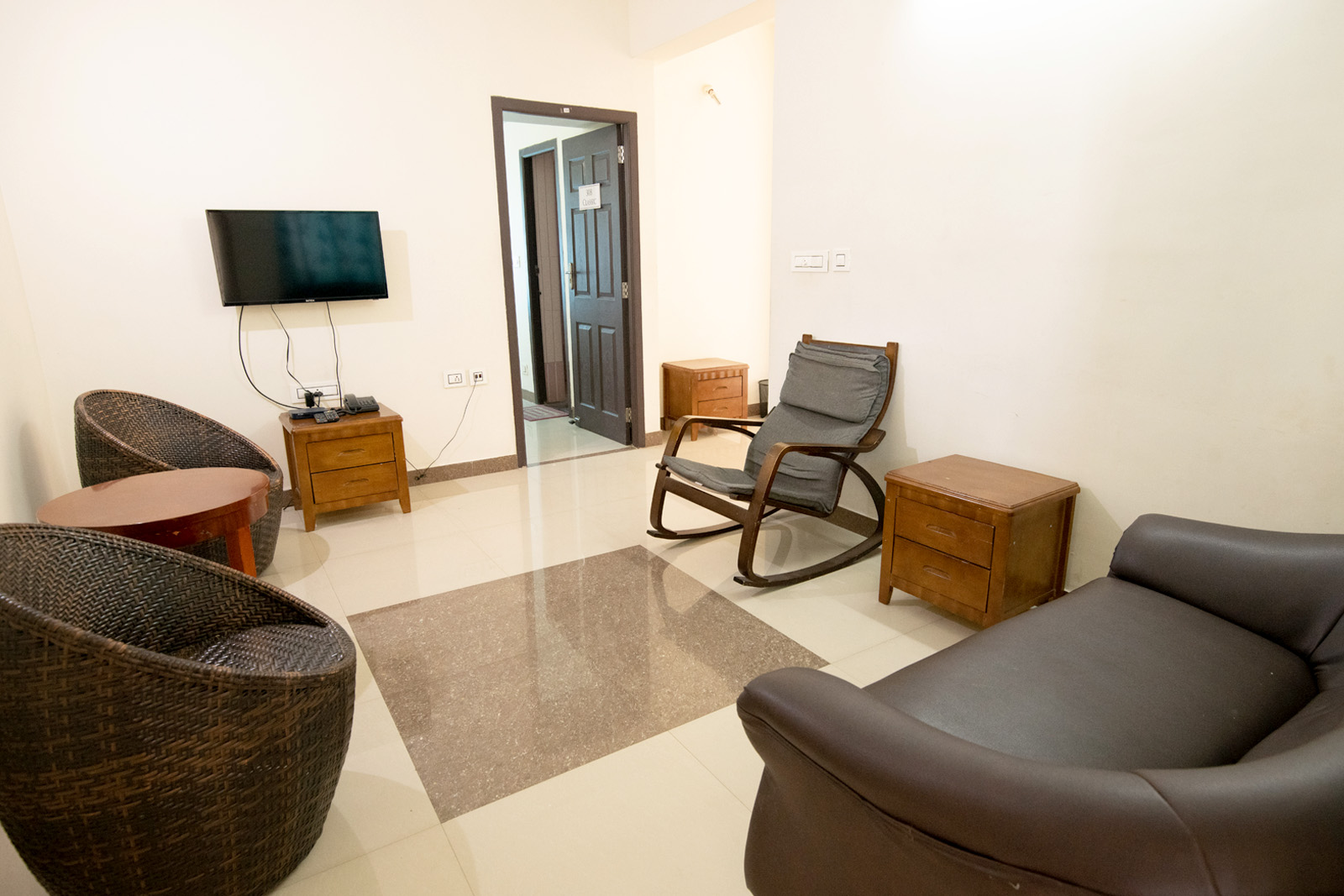 Guests can relax in the spacious living room and enjoy meals in the dining area, which also boasts a scenic balcony view. The fully equipped kitchen allows for easy meal preparation with modern appliances. For larger groups, the apartment can be configured with two extra roll-away beds, accommodating up to 8 guests. The Elite 3BHK Apartment combines comfort and elegance, making it the perfect home away from home.