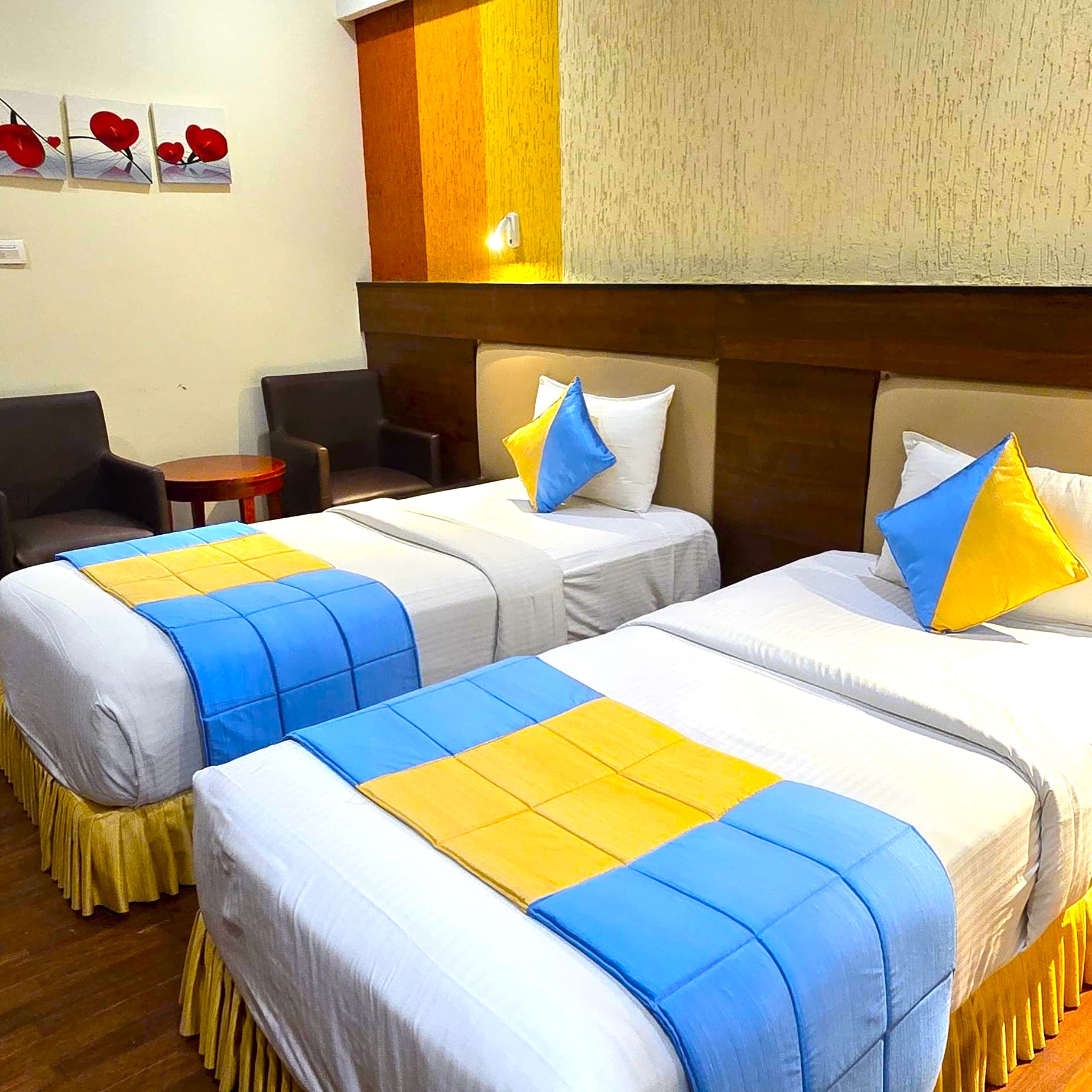Our hotel offers rooms for every need. The Family Suite is ideal for four, Luxury Rooms feature king-size beds, Executive Rooms come with twin beds for friends or colleagues, and Economy Rooms provide a comfortable option for solo travelers. A comfortable stay awaits.
